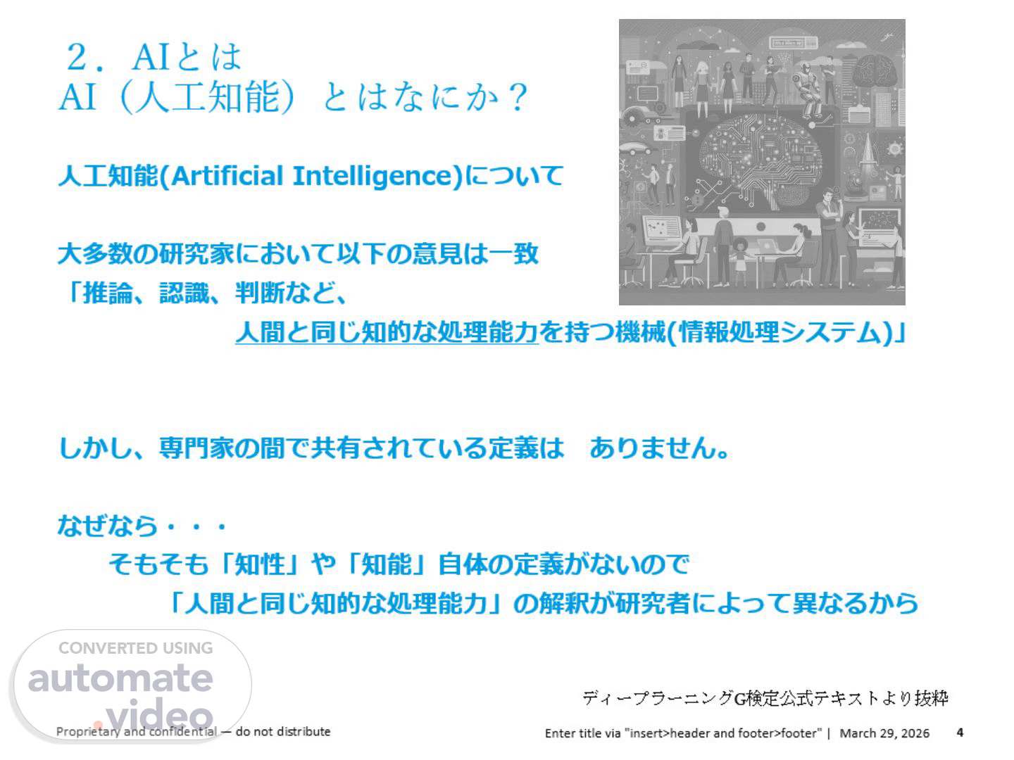 [Audio] 2.AIとは AI(人工知能)とはなにか? 人工知能(Artificial Intelligence)について 大多数の研究家において以下の意見は一致 「推論、認識、判断など、 人間と同じ知的な処理能力を持つ機械(情報処理システム)」 しかし、専門家の間で共有されている定義は ありません。 なぜなら・・・ そもそも「知性」や「知能」自体の定義がないので 「人間と同じ知的な処理能力」の解釈が研究者によって異なるから ディープラーニングG検定公式テキストより抜粋 本番の説明に入ります。まずはAIです。 人工知能 Artificial Intelligenceに対して、推論、認識、判断など、人間と同じ知的な処理能力を持つ機械 情報処理システムであるという認識は、研究家たちの間で共通しています。 しかし、実は共有された定義はないそうです。 これは、そもそも人間の持つ知性や知能の定義がないからだそうです。 たしかに私たちは、人間が考えている という状態が、どのような物理現象であるか・・・ 脳の中で何が起きているかなどを、まだ正確に知りえていません。 意識と呼ばれるものがどこから来ているのか・・・まだ私たちは知らないのです。 このため、人間と同じ知的な といっても、その解釈は人によって異なります。 このため共有された定義がないということにるそうです。 ちなみに現在のAIは大量のデータをもとに出力を生成しますが、意識や感情、自己認識といった人間の知性の根幹を持っているわけではありません。.
